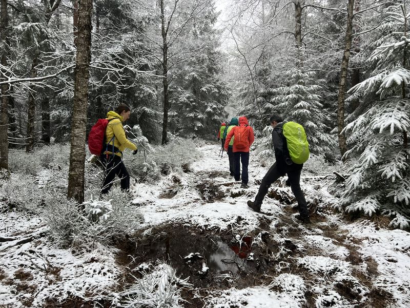 Heidi berichtet: Am Donnerstag legte Frau Holle bis zu 20 cm Neuschnee auf unsere Strecke. So stellte sich im Vorfeld die Frage: Solle ma, oder solle ma ned? Gerhard, mit seinem besonderen Humor, fand die Antwort: bringe mas hinna uns. Ausgerüstet mit Grödel, Gamaschen und Wanderstöcken stiegen wir am Wittig aus den Autos, um gleich festzustellen, dass die Außenschale von Freddys linkem Winterwanderboots aufgeplatzt war. Steffen hatte Panzertape dabei. Wir begannen mit der notdürftigen Reparatur und mussten sie bald wiederholen. Freddy blieb guter Dinge, denn der Innenschuh hielt seine Füße weiterhin trocken und warm.