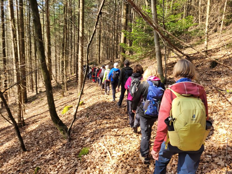 Maria berichtet: Am Palmsonntag machte sich eine fröhliche Gruppe von 17 Wanderern mit Doris achtsam und streckenweise schweigsam oder mit verbundenen Augen auf den Weg. Besonderes Augenmerk galt bei dieser Tour der Wahrnehmung unseres Körpers und der umgebenden Natur, auf unserer Atmung und den vielfältigen Sinneseindrücken. Die Wanderung führte uns von Dobel über den ehemaligen Lehmannshof zur Schirmhütte (dort Mittagsrast inklusive herrlichem Blick auf Dobel) und über die Eyachmühle zurück nach Dobel. Von dort ging es mit Bus und Bahn zurück nach Ettlingen. Wie können 17 Personen wortlos gleichseitige Dreiecke entstehen lassen? Wir wissen es nun. Herzlichen Dank an Doris für die schöne Tour und die vielfältigen Erfahrungen.